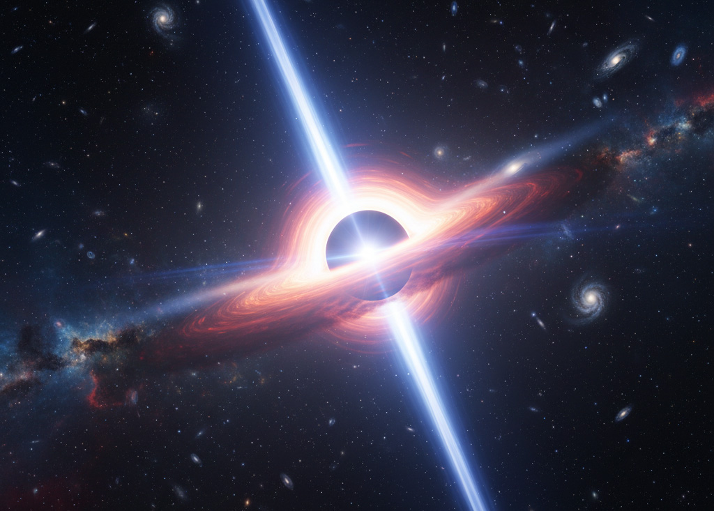 その正体は、銀河中心に存在する「超大質量ブラックホール」が、周囲のガスや塵を猛烈な勢いで吸い込む際に発生するエネルギーです。ブレーザーが他の活動銀河核と決定的に違うのは、ブラックホールの両極から噴射される「相対論的ジェット」と呼ばれる超高速のプラズマのビームが、ほぼ真っ直ぐ地球(観測者)の方向を向いている点にあります。