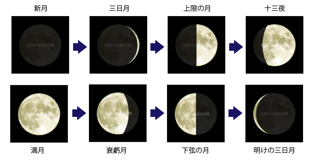 - 日本: 月の「見た目の形」や「昇ってくる時刻」そのものの変化に注目し、擬人化するなど風流な名前を付けた。